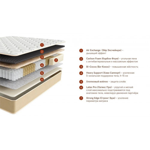 | Наполнитель | Пена Carbon Foam, Bi-cocos, НПБ Heavy Support, хлопковый войлок, Latex Pro, периметр Strong Edge |