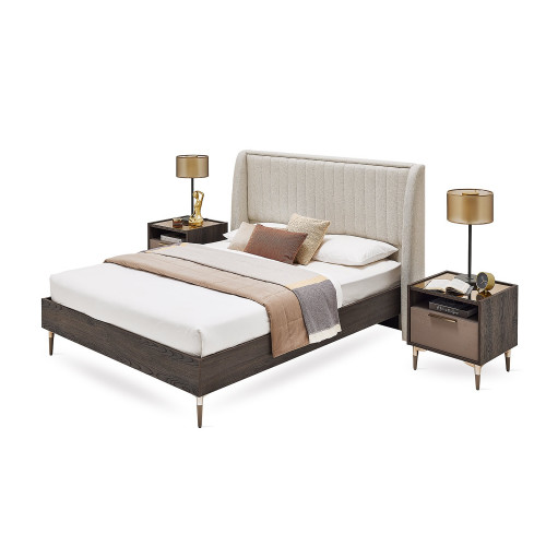 В спальне Rebeka натуральные тона сочетаются с бронзовыми деталями, что придает жилому пространству эстетичный вид. Специальная прострочка на изголовье, большой объем и детализированные бронзовые зеркала на шкафах сочетают функциональность и эстетику. Он демонстрирует эксклюзивный и женственный подход к дизайну с его современными линиями, глубокими деревянными текстурами и зеркальным дизайном, обогащающим серию. Его ручки, контрастирующие с бронзовыми деталями, гармонично сочетаются с дизайном комода и тумбочки, обеспечивая эстетический отклик на дизайн серии.